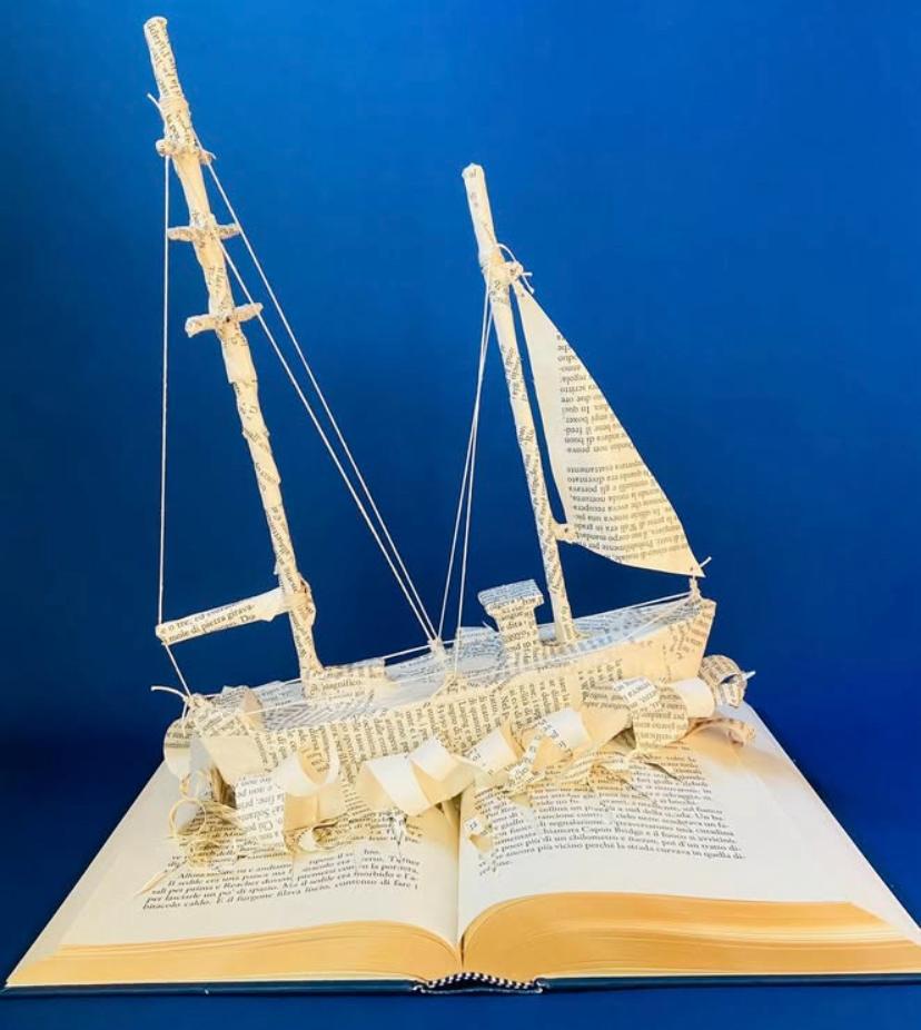 Da queste pagine dimenticate prendono vita piccole sculture cariche di poesia: fari, onde, creature immaginarie che sembrano emergere dal racconto stesso. Ogni libro si trasforma in un palcoscenico narrativo, dove la carta diventa volume, emozione e stupore.